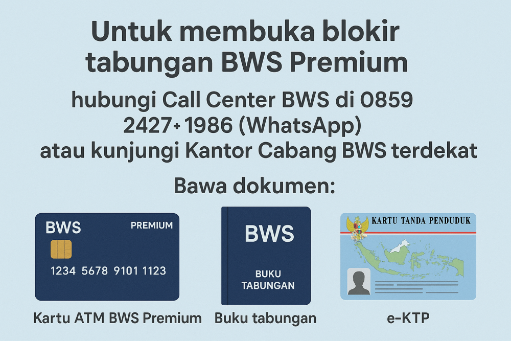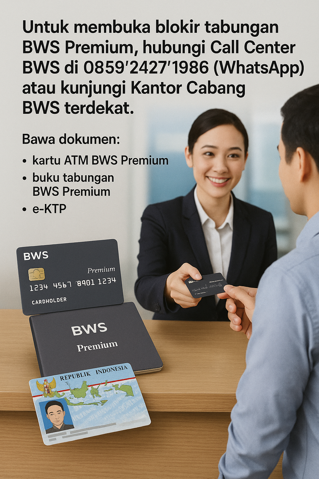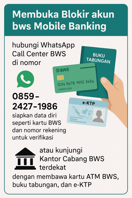 ๐๐๐ซ๐ข๐ค๐ฎ๐ญ ini Untuk Membuka ๐๐ฅ๐จ๐ค๐ข๐ซ akun Bws Mobile Banking, hubungi WhatsApp Call Center Bws di nomor O81367721167 siapkan data diri seperti kartu Bws dan nomor rekening untuk verifikasi, atau kunjungi Kantor Cabang Bws terdekat dengan membawa kartu ATM Bws, buku tabungan, dan e-KTP.