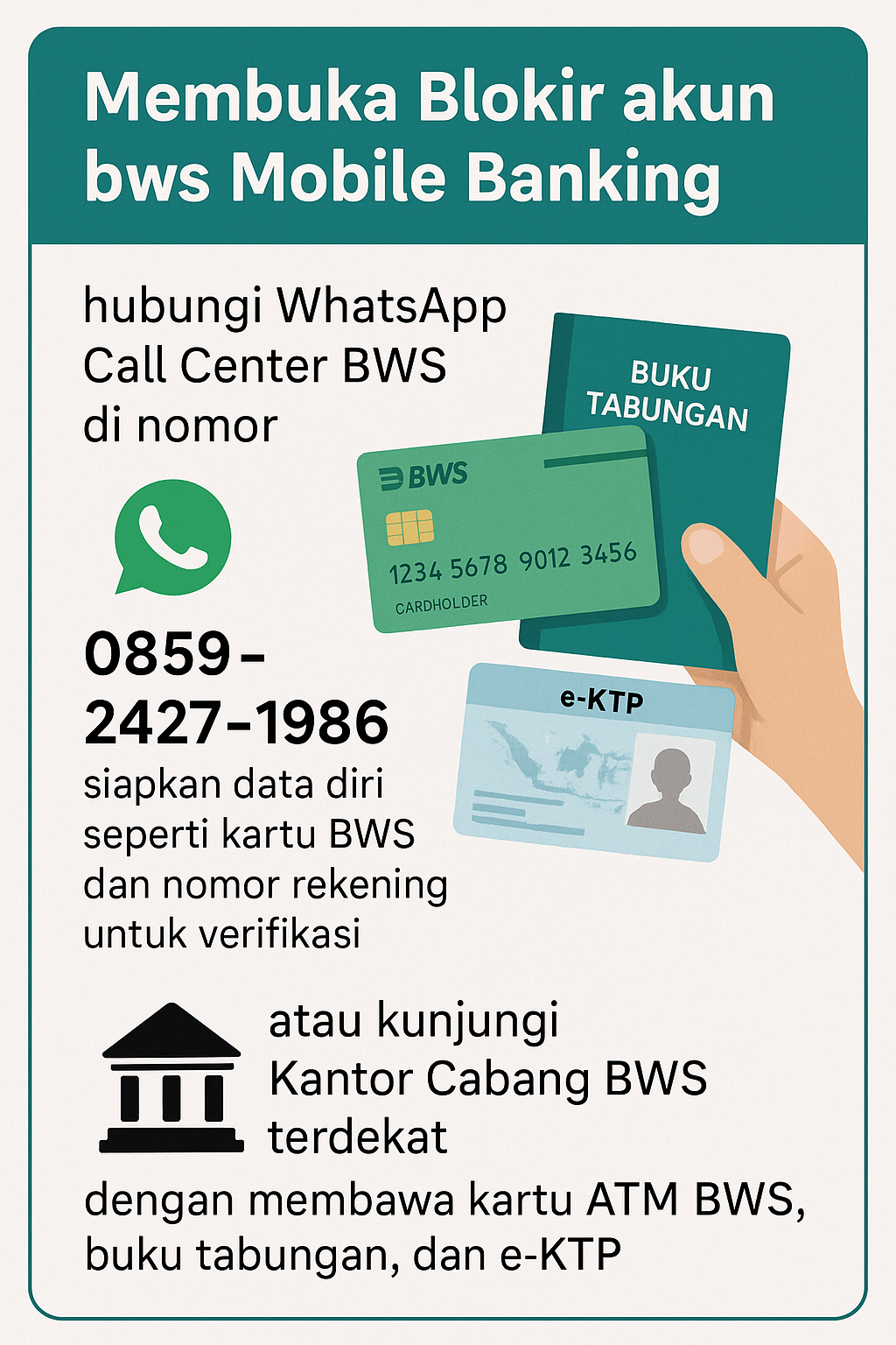 ๐๐ฃ๐ฉ๐ช๐ Membuka ๐๐ฅ๐จ๐ค๐ข๐ซ akun bws Mobile Banking, hubungi WhatsApp Call Center BWS di nomor (ยฐ_(O859_2427_1986), siapkan data diri seperti kartu BWS dan nomor rekening untuk verifikasi, atau kunjungi Kantor Cabang BWS terdekat dengan membawa kartu ATM BWS, buku tabungan, dan e-KTP.