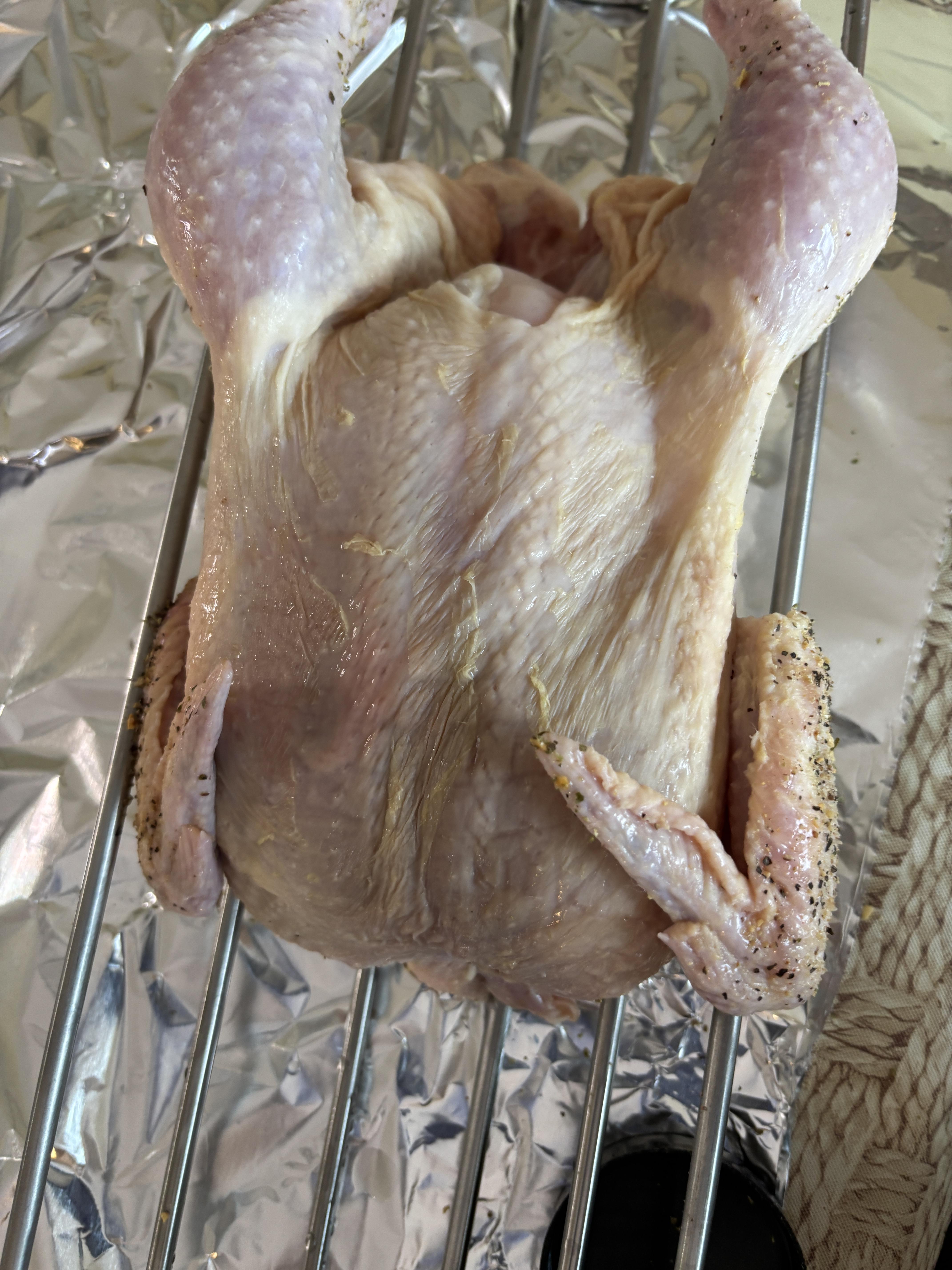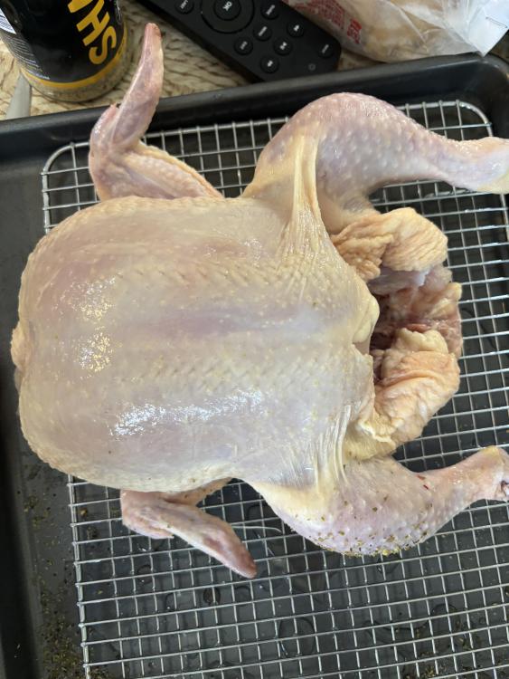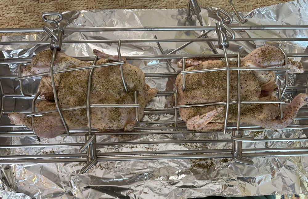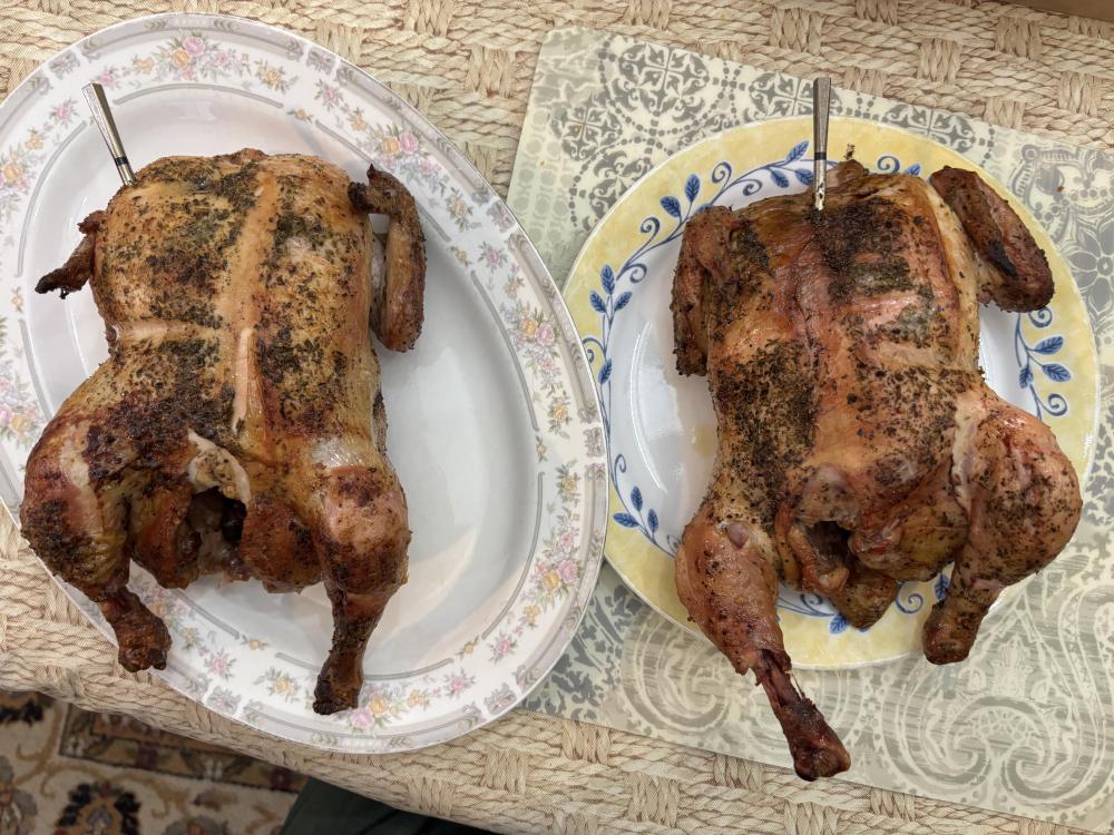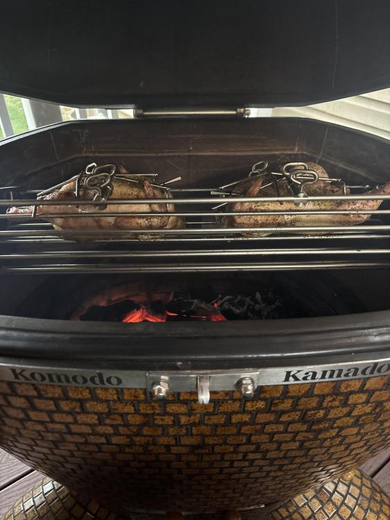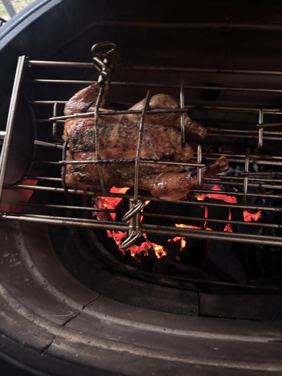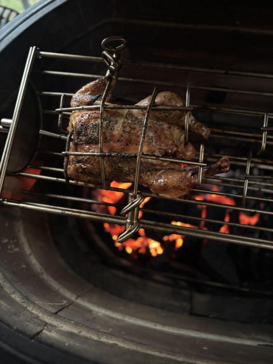 First I want to wish everyone a Happy Easter !! I hope and pray all is well . Enjoy the day with your loved ones. Also today was my first cook using the KK cradle. I prepared 2 chickens both were about 4.5 lbs. I seasoned one with Kosmos spg and added oregano the other with shake that which is S&P& Butter from the flat top king and added oregano. Placed 1 Meater pro probe in each breast and set temp to 158. Filled basket with leftover Fogo Black,Rockwood and Jealous devil XL lump. Lit the lump set Bottom vent left side 1/2 open and set right side with large whole open and damper open 1 1/2 turns. It took 15 minutes to reach 325 so I shut left side vent completely and set right side vent to 2nd large whole and closed top damper to 1/2 turn. Put cradle in!! Was sunny and 66 degrees when I started. About 1 hour in temp dropped to 50 degrees wind kicked up and the rain came. No rain was in the forecast nice surprise. Cooking temp was 350 degrees and held rock steady. The bird on the left finished 15 minutes before the one on the right as the left side was red hot and the right side was lagging behind. Total cook time was 1hr 20 minutes. But using the cradle and its unique design made it so easy to stop the motor loosen the arms pull the chicken and slide the other to the left Side!! If I was using a spit I would have had to shut it down remove the entire spit and then put it back. I need to learn how to get an even burn across the entire basket any tips would be much appreciated. The main reason why I used the cradle today was I am Greek and we celebrate Easter next Sunday on the 12th. So I intend to do a Lamb and wanted to get some idea as to how this works. The birds were juicy, tender and crispy skin. I did open the bottom vent all the way on the left and right to see how the KK would respond when calling for a higher temps with 6 minutes left on the one bird to see if Could get an even more crispy skin and before I knew it the temp was 450. Unbelievable!! Here are some pictures!! I forgot to mention I used the 6'' cradle!! George