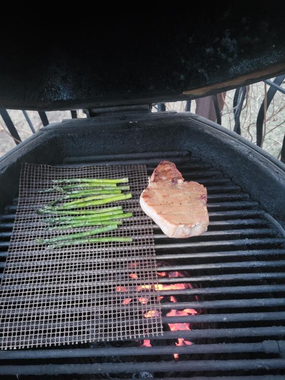 Excellent. It finally got above freezing here, so it's grilling time! First time firing up the KK in 2026! Fat pork chop abd asparagus.