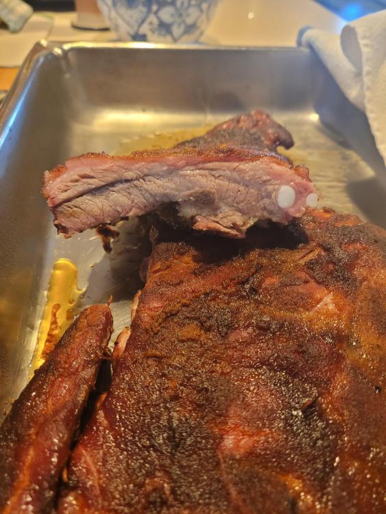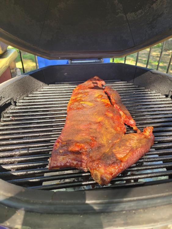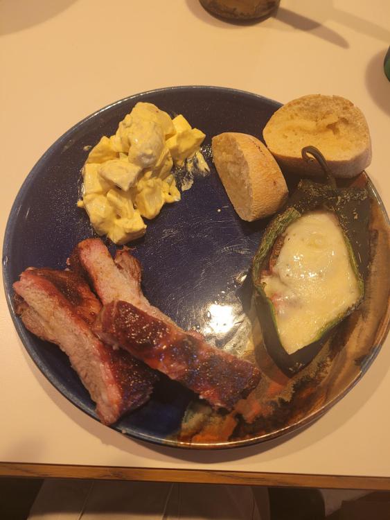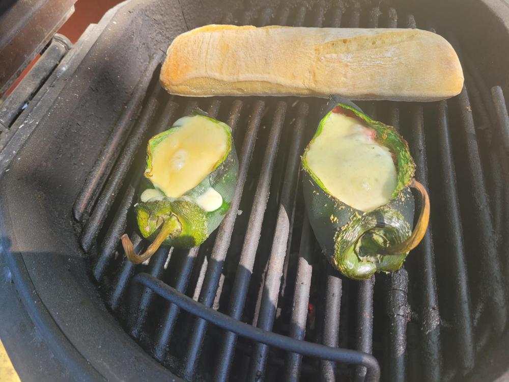 Cooked a rack of spare ribs on the 23 and a couple of relleno's on the 16 for lunch today. The spares were indirect with a few chunks of peach on the coals. I used poblano peppers 1 stuffed with a Roma tomato, onion, Italian seasoning and sharp white cheddar. The other for my wife was a mix of white cheddar and gouda. Cook on KK'ers Steve