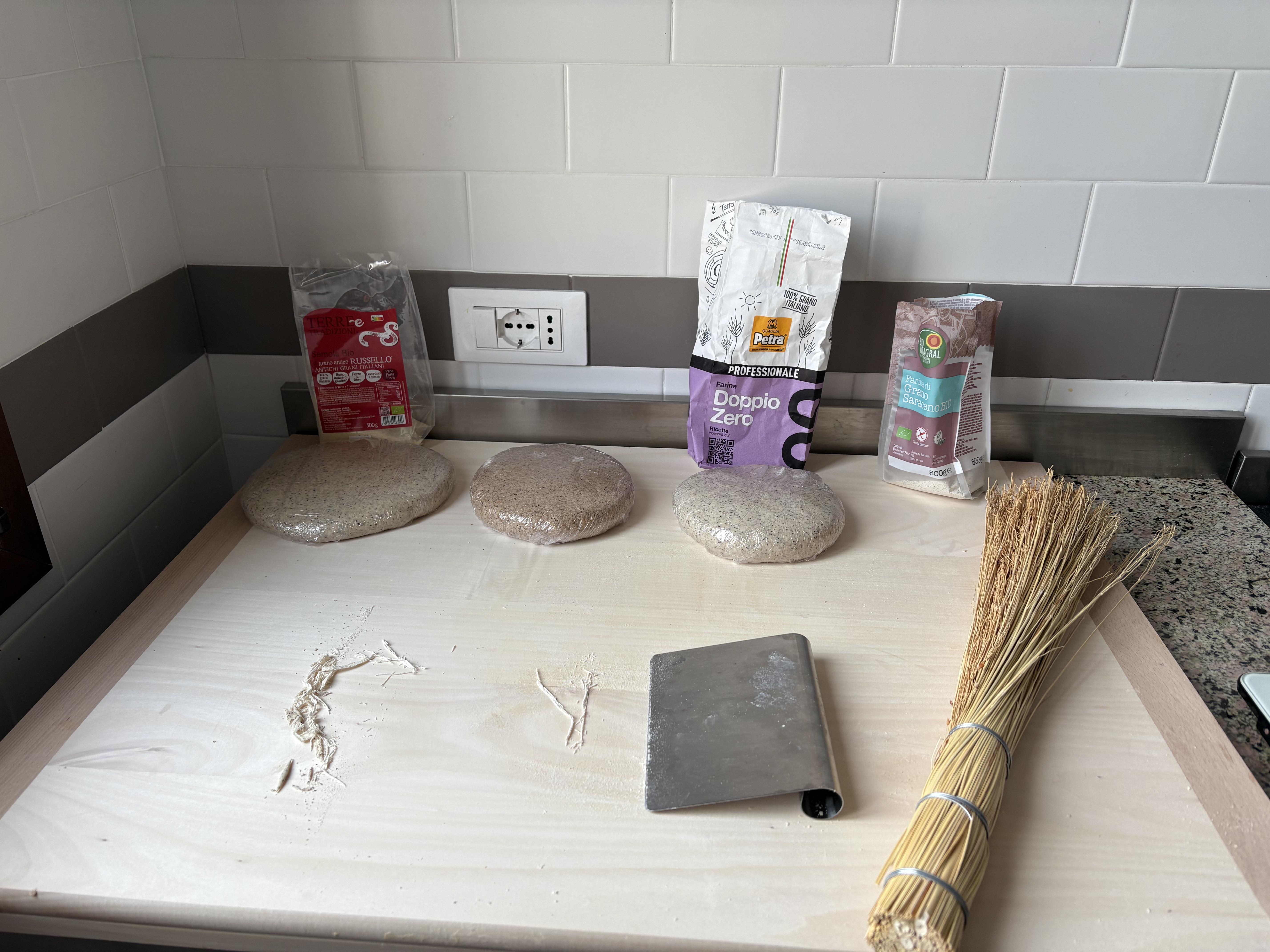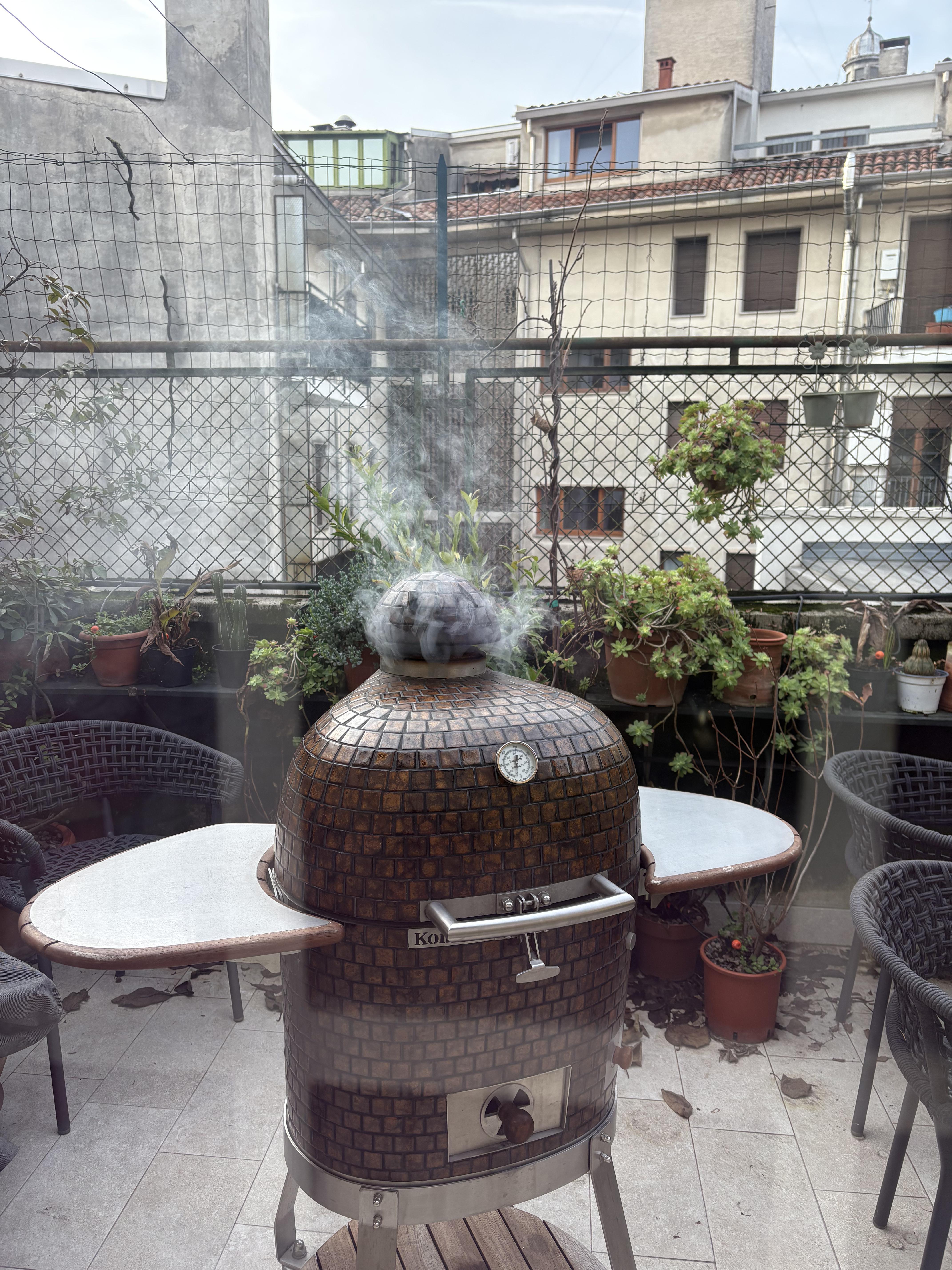 Back in Italy to enjoy the lead up to Christmas. Cooked ribs on the 16 last night. Came out great. No pix. Used the heat shield/paving stone for the first time. It was a good call, the short distance between the fire box and the grate means I have found it difficult to genuinely cook low and slow without something to shield the bottom of the food from the fire. I am near Venice and in the home of bigoli pasta. Today I am trying three versions using a Chad Robertson recipe that uses up spent leaven. Here we are at the first stage: I am experimenting. Bigoli are made with buckwheat flour as the base. I made three variations. The first with durum wheat, the second with whole wheat flour ground from UK hard wheat grains and the third with Italian 00 flour. I followed the quantities for the recipe without thinking for the first one with durum wheat. It was too wet and I made the necessary adjustments for the second two. Will see how each extrudes, using the bigolaro, later today. KK action? Boiled meats are a speciality here and, as well as capons, they include beef short ribs. I have set the KK going and will do a nice slow cook in place of boiling and will see what the Italians think of it. Warming up now: