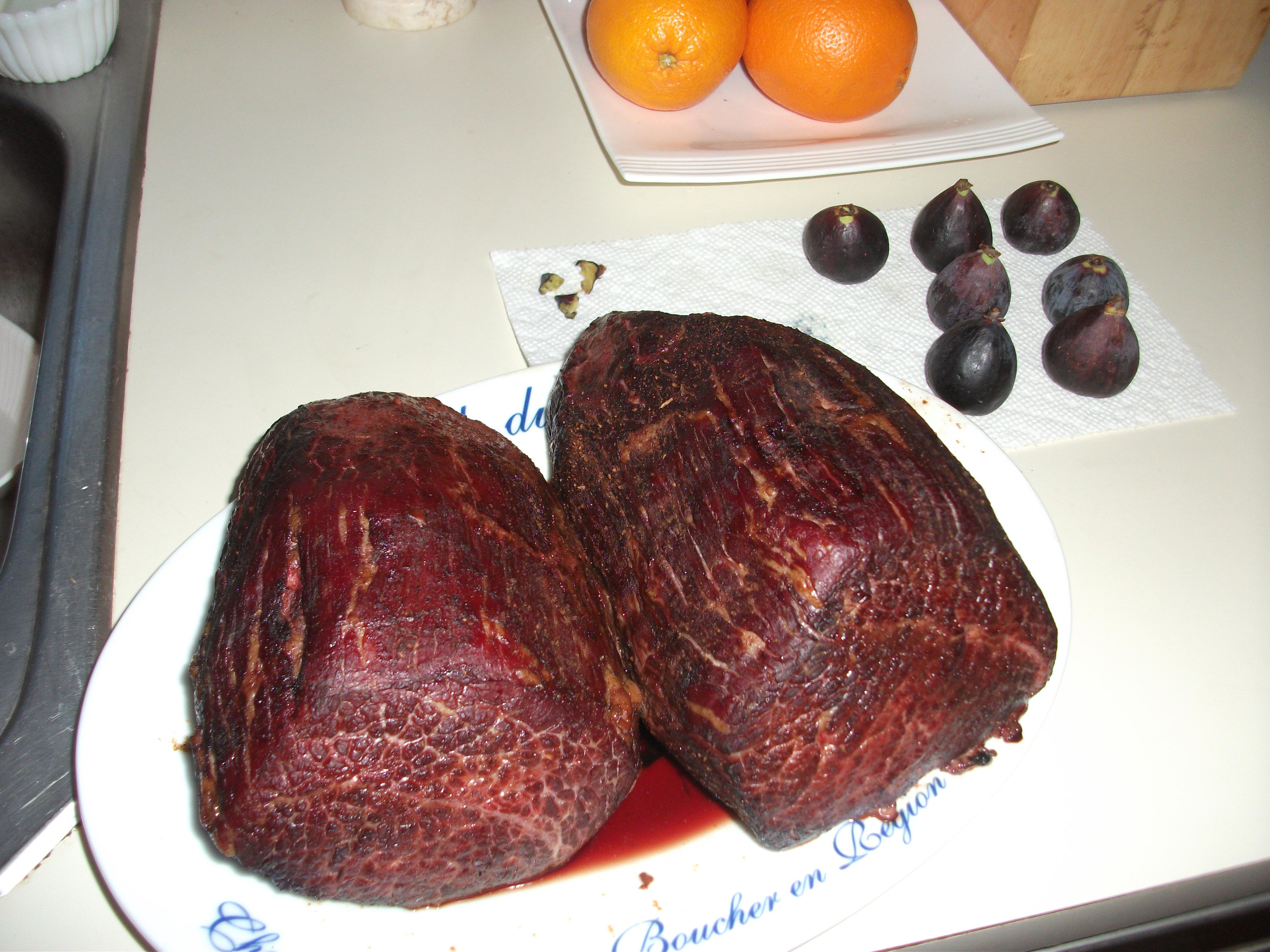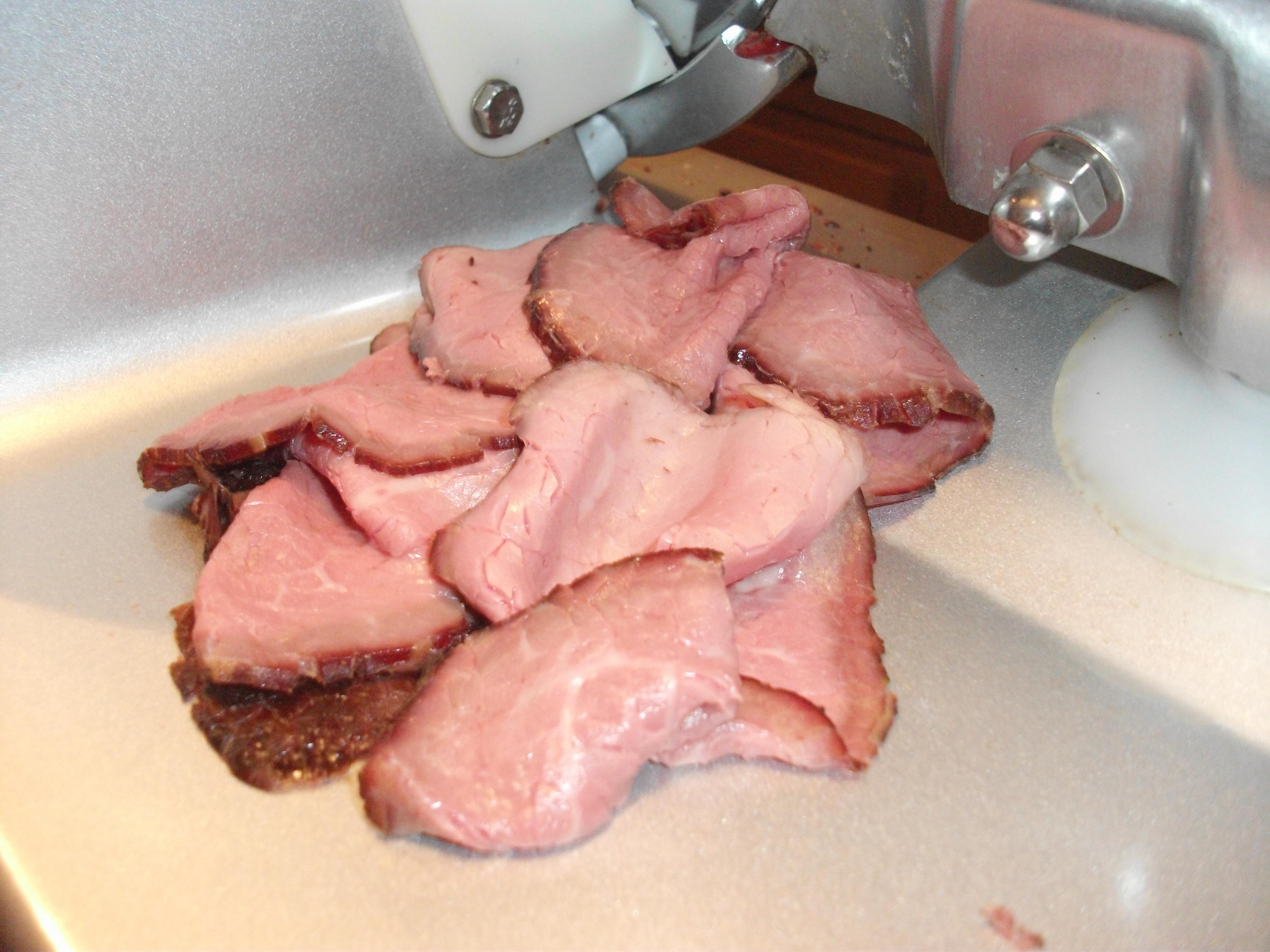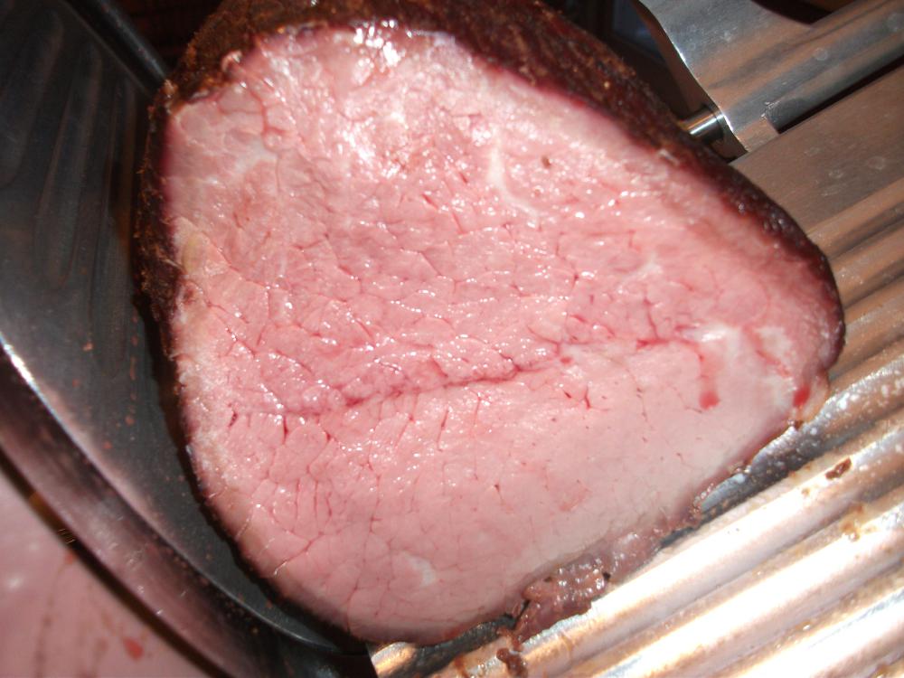 The best roast beast is rare, sliced thin piled high on an onion bun, topped with BBQ sauce and Mayo. At least they what they do up on the north shore here in Massachusetts at several Roast Beef shops. It's a staple some people get in the car and travel miles to for a fix of roast beef pleasure. I didn't make the sandwich but you get the point. Two top round cuts, smoke cooked slow at 225 with the deflector for 2 and 1/2 hrs there about probing at 130-135, given a nice rest and then sliced and portioned out in freezer vacum seal bags. You can also use choose bottom round, but I find the top round a cleaner presentation. Easy cook, choose your own beef rub.